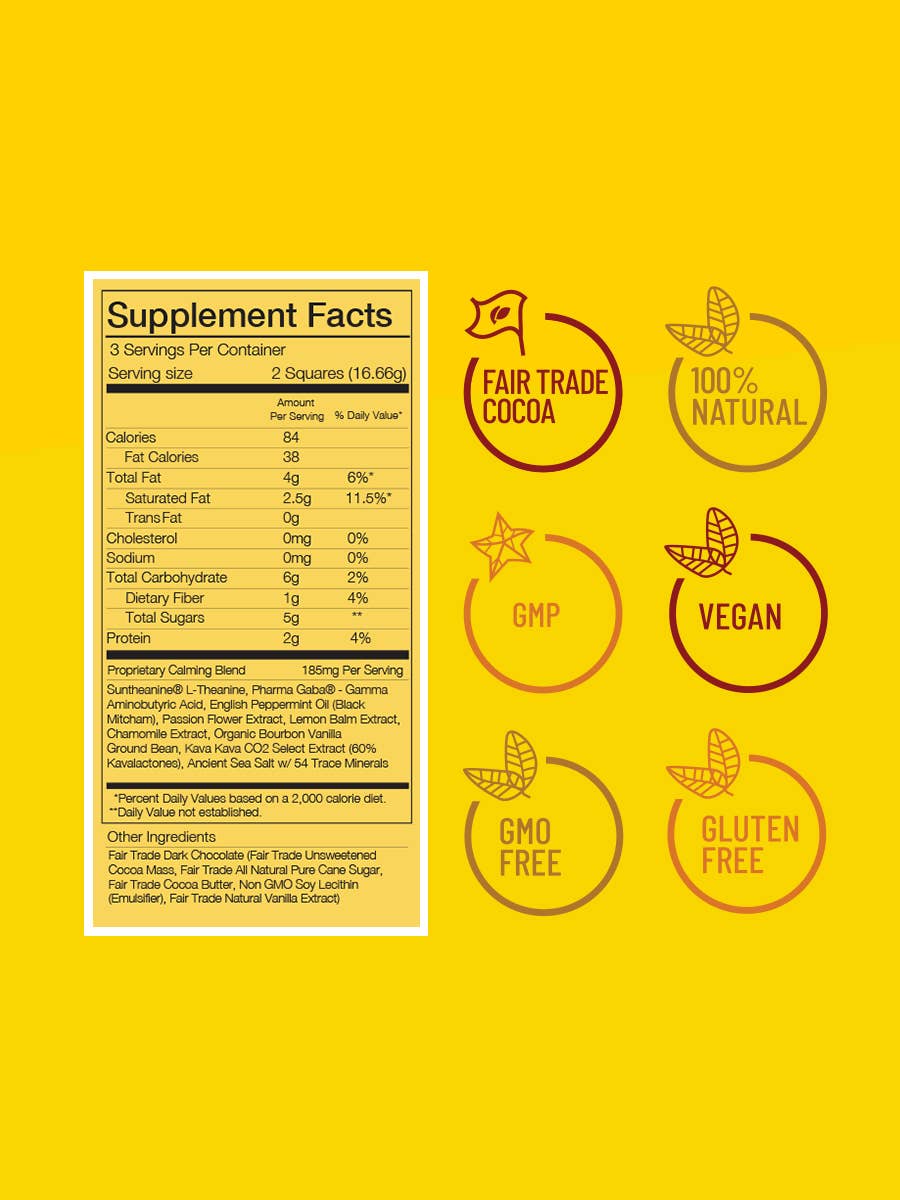 Functional Dark Chocolate formulated to address the issues associated with stress and anxiety. Clinically researched ingredients supported with vitamins, herbs & minerals, delivered in delicious dark chocolate.