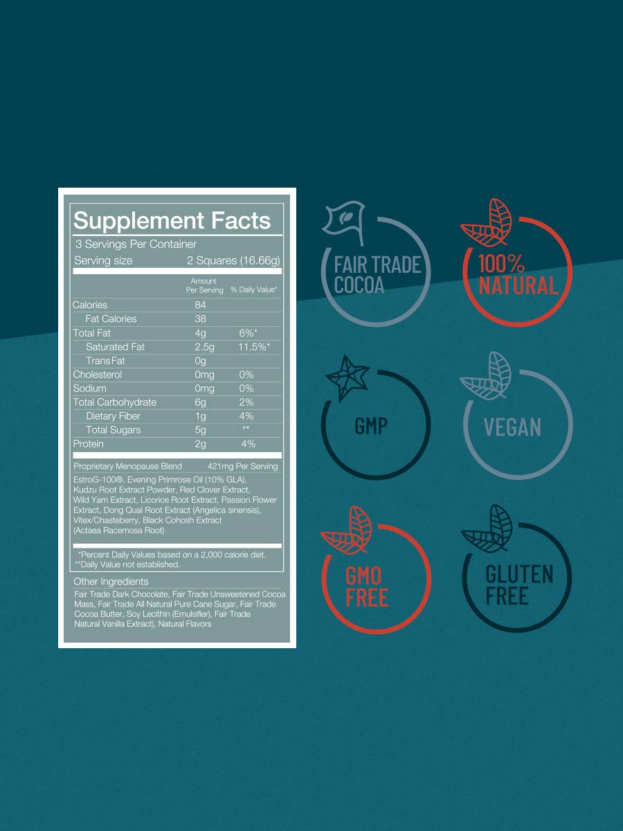 Functional Dark Chocolate formulated to address the issues associated with Menopause. Clinically researched ingredients supported with vitamins, herbs & minerals, delivered in delicious dark chocolate.