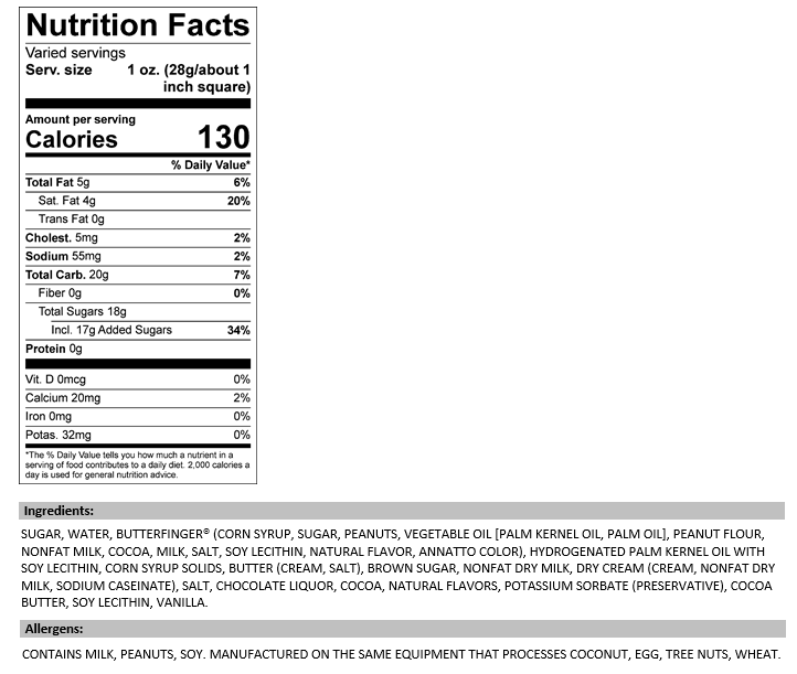 Our Fudge is always made with fresh high quality ingredients, including 100% Real Wisconsin Butter! This fudge is sure to please! It's made with our delicious and creamy, Vanilla Fudge and real Butterfinger pieces! As if that wasn't enough, we top it off with a drizzle of decadent Chocolate Fudge.